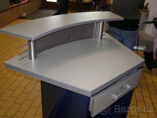 Modrostříbrná čtvrtkruhová recepce s nerezovými doplňky, rampou a uzamykatelnou zásůvkou. Vhodná do vstupních prostor penzionu, kadeřnictví, solárií a.t.d.Původní cena 39000,- Kč