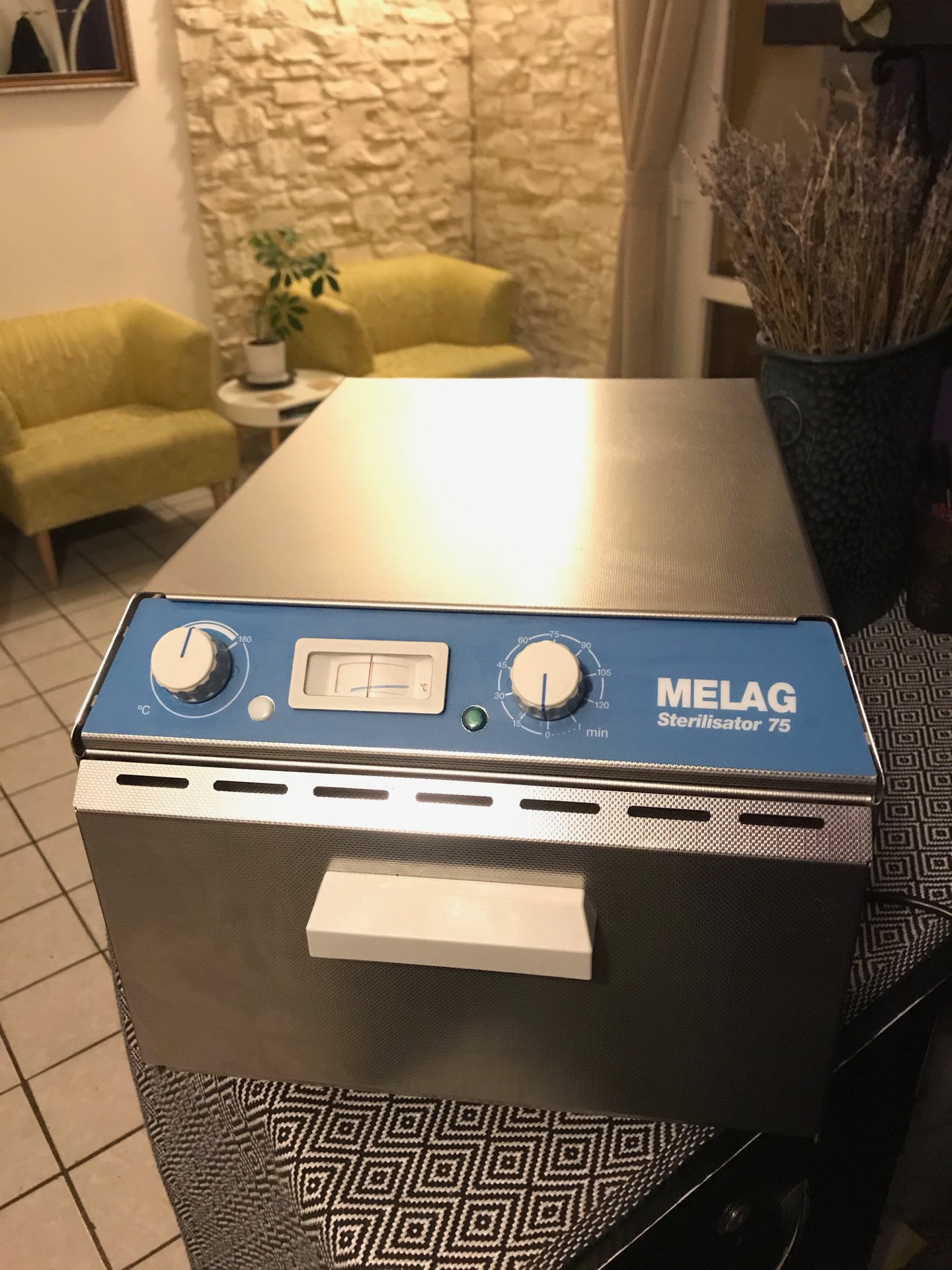 Horkovzdušný sterilizátor s nucenou cirkulací vzduchu, který odpovídá všem platným zákonům a předpisům pro provoz pracoviště kosmetiky, pedikúry, kadeřnictví nebo tetovacího studia.Je určený ke sterilizaci předmětů z kovu, skla, keramiky, kameniny apod.Vnější provedení je nerezové. Přístroj je plně automatizován.Sterilizační teplota: 20min. 180°CV dodávce přístroje je držák ,návod k požití a certifikace přístrojeVelikost přístroje: 31x26x42 cmObjem: 4lHmotnost: 12kgMinimálně používaný. Stav odpovídá novému přístrojiPůvodní cena :13 900kčNová cena : 10 000kčbližší info na tel. 734 734 761
